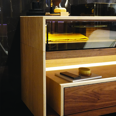 Alors que les prototypes des meubles arrondis ELIPSE et ECLECTIC ont été présentés en avant-première lors des événements Architect@Work organisés à Milan et à Paris en novembre 2023, les meubles EXCELLENT feront leur première apparition publique au Salone del Mobile 2024. Il s’agit de la collection la plus précieuse et la plus ambitieuse jamais proposée par MOMA Design, un meuble doté d’une structure portante en marbre, d’une alternance de plateaux et d’éléments de rangement disponibles dans de multiples finitions en bois ou en verre bronzé. La version présentée au Salone se compose d’une structure en marbre Travertino et de tiroirs en noyer Canaletto et en verre bronzé, ce qui se reflète également dans le lavabo « encastré » dans la partie supérieure du meuble.